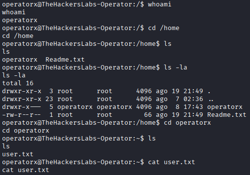 Con el comando «su operatorx» e introduciéndole la contraseña anterior, ya estamos dentro. Ahora si nos movemos a la carpeta /home y luego al usuario /operatorx , vemos la user flag.
