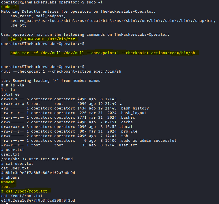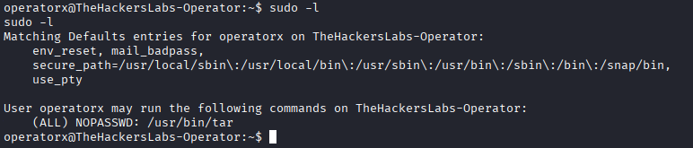 Como el usuario operatorx puede ejeuctar el binario tar como usuario root, lo que podemos hacer es lo siguiente: