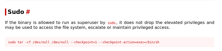 En este punto podemos ir a GTFObins para buscar el binario «tar» y ver cómo acceder a root mediante el comando siguiente: