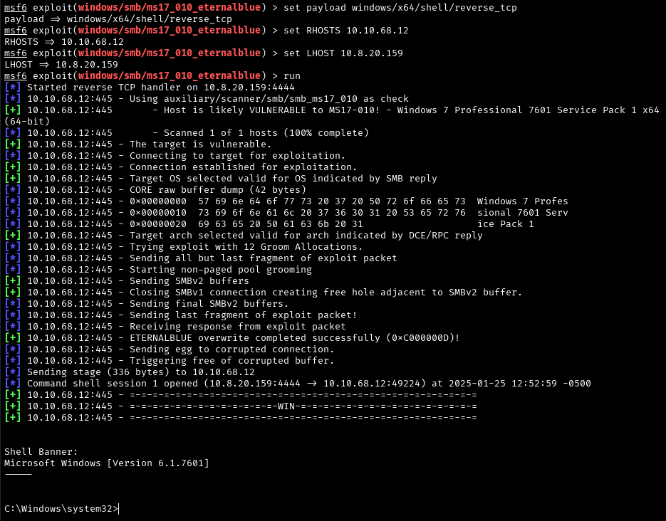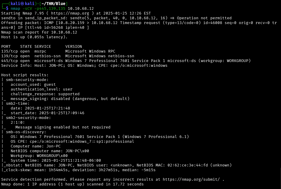 El objetivo es vulnerable a MS17-010 (EternalBlue), una vulnerabilidad crítica que permite la ejecución remota de código en sistemas con SMBv1 («Windows SMB Remote Code Execution Vulnerability»). Esta es una excelente oportunidad para explotarla y ganar acceso al sistema.