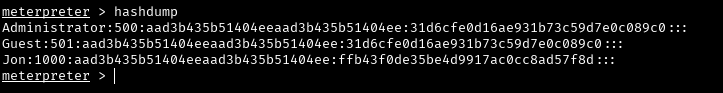 desde la sesión de Meterpreter (exit desde la shell de Windows) para volcar los hashes de contraseñas. - Identificamos el hash del usuario no predeterminado (Jon).