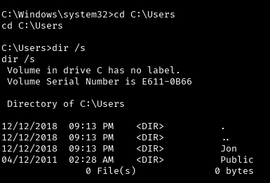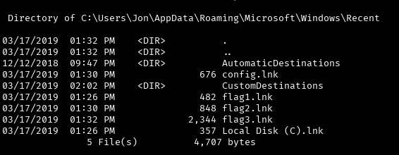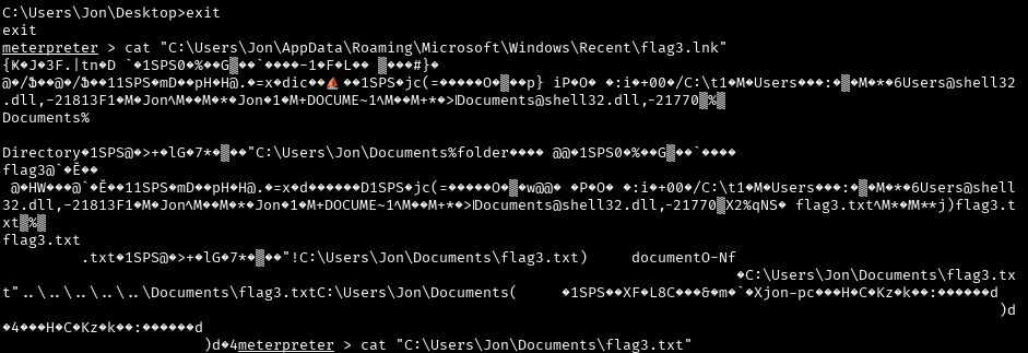 . - Cuando listamos todos los usuario de la máquina Windows explotada y directorios, vemos una ruta donde se almacena un enlace a la flag3 dentro del usuario Jon.