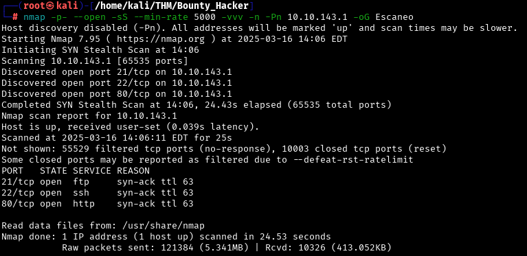 Comenzamos primero viendo si la máquina está activa y podemos conectarnos a ella, y después continuamos con el descubrimiento de puertos para luego hacer un escaneo de los servicios y versiones que corren para esos puertos.