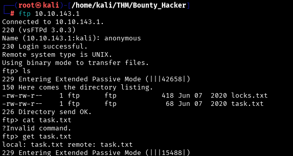Una vez dentro exploramos que hay dos ficheros .txt, que descargamos en nuestra máquina local mediante el comando «get», y después abrimos con «cat» en nuestra carpeta de la máquina: