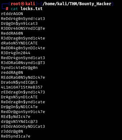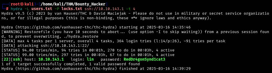 Una vez tenemos el listado de contraseñas y el de usuarios, vamos a lanzar un Hydra contra el puerto 22 ssh para averiguar el usuario y contraseña vulnerable a la máquina.