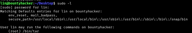 Sin embargo no somos root, sino usuario lin, pero con el comando sudo -l vemos que lin tiene permisos para ejecutar /bin/tar como root, por lo que podemos abusar de esta capacidad para obtener una shell como usuario root.
