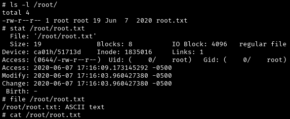 y si ejecutamos «whoami» somos root. Ahora basta con llegar a root.txt, para ello ejecutamos: