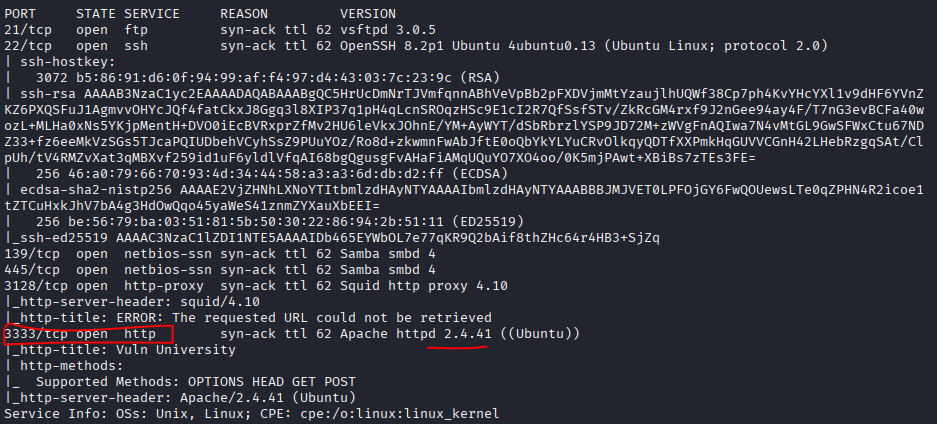 Realizando la primera fase del escaneo, se detectan los puertos abiertos: 21 ftp, 22 ssh, 139 netbios, 445 smb, 3128 proxy http y 3333 (servicio/aplicación web) . Esta máquina corre bajo un SO Linux por el TTL de 62 que nos muestra arriba (64 sin nodos intermediarios de ida y vuelta).
