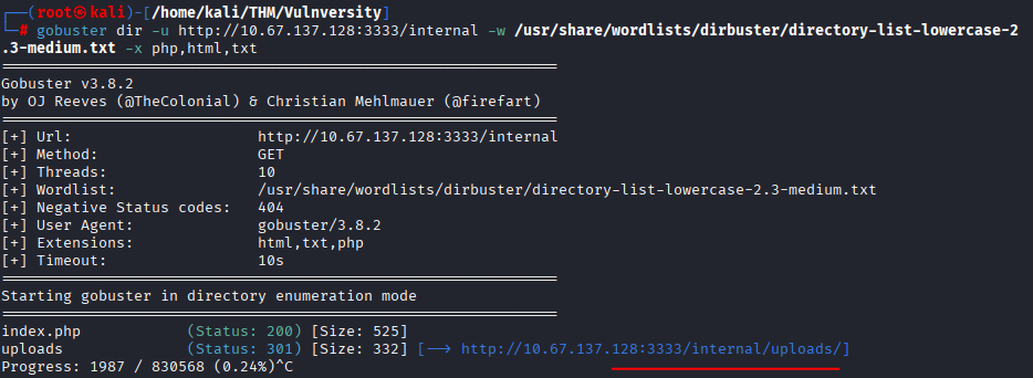 Volvemos a hacer fuzzing pero en este caso sobre el directorio /internal , y nos encuentra la ruta /uploads, que efectivamente es donde el servidor aloja los archivos subidos.