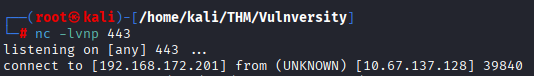 Una vez cambiada la extensión al payload y subido al servidor, nos ponemos en escucha con netcat por el puerto 443 (el mismo que pusimos al crear el payload con msfvenom). Y al clicar sobre ese fichero «pwned1.html» desde esa carpeta uploads, nos conecta al servidor de la máquina en nuestra máquina atacante en netcat: