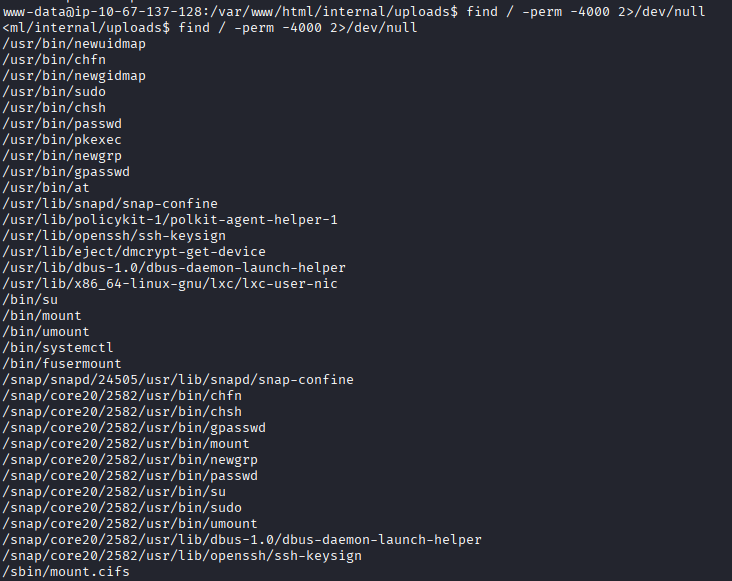 Para ello vamos a ejecutar el siguiente comando que nos permitirá encontrar binarios en el sistema con permisos SUID que podamos explotar para ejecutar como root: