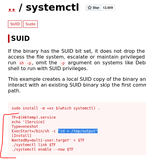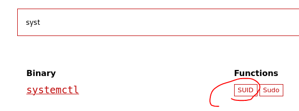 En este caso pruebo directamente con los que considero más raros, como es el de «systemctl», y efectivamente encuentro que hay opción SUID en la escalada: https://gtfobins.linuxsec.org/gtfobins/systemctl/#suid