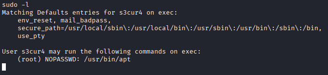 Si volvemos a ver los permisos de este usuario con sudo -l vemos que puede ejecutar un binario apt como root sin contraseña: