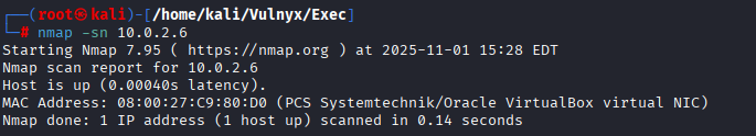 -Pn: le dice a nmap que no haga un «ping» a la dirección IP antes de escanearla. Con-Pn, nmap asumirá que el host está activo y procederá directamente al escaneo de puertos, útil si el host bloquea pings.10.0.2.6 : es la IP de la máquina víctima.