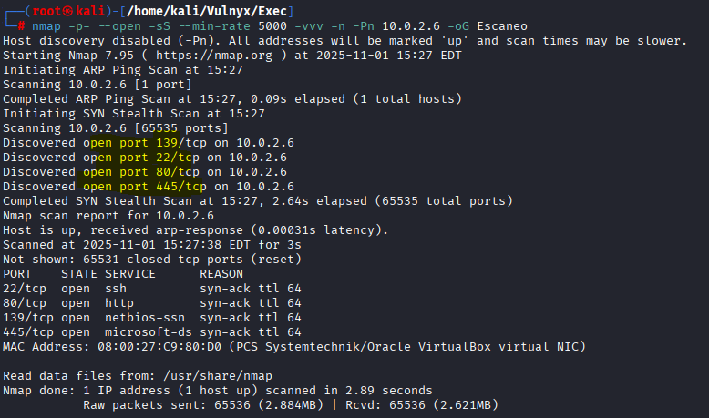 sudo nmap -p- --open -sS --min-rate 5000 -vvv -n -Pn 10.0.2.6 -oG Escaneo