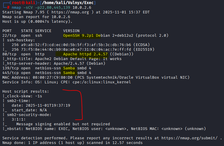 clock-skew -1s: el reloj del host está casi sincronizado con tu máquina. No es problema de seguridad por sí mismo.smb2-time(date: 2025-11-01T19:37:19): confirmación adicional de que el servicio SMB responde y su hora. Útil para correlación de logs.smb2-security-mode: Message signing enabled but not required: SMB message signing está soportado pero no forzado. Es posible intentar ataques de relay / spoofing en redes donde se pueda interceptar tráfico.nbstat: NETBIOS name: EXEC: el nombre NetBIOS del host es EXEC. Útil para búsquedas de shares o para correlacionar con otras máquinas.