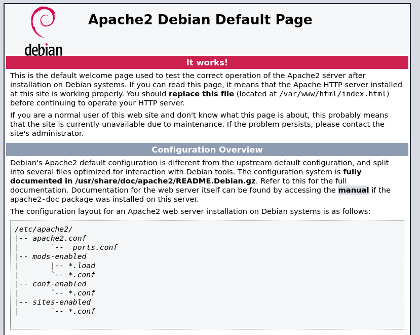 Si dejamos por ahora aparcado la parte de inmersión por SAMBA e intentamos acceder por navegador a la IP víctima puerto 80, vemos que se trata de la página de Debian por defecto (a priori sin más información).