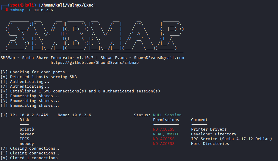 smbmap -H 10.0.2.6lista y prueba accesos a recursos compartidos SMB (Server Message Block, usado por Windows para compartir archivos, impresoras, etc.).Disky las filas son los nombres de los shares:print$,server,IPC$,nobody.Permissionsmuestra el permiso para cada share desde tu conexión actual (NULL session).server READ, WRITEsignifica que puedes listar, descargar y subir archivos en\\10.0.2.6\serversin autenticarte.print$yIPC$NO ACCESS.print$son drivers yIPC$es para RPC/IPC. No te preocupan ahora.