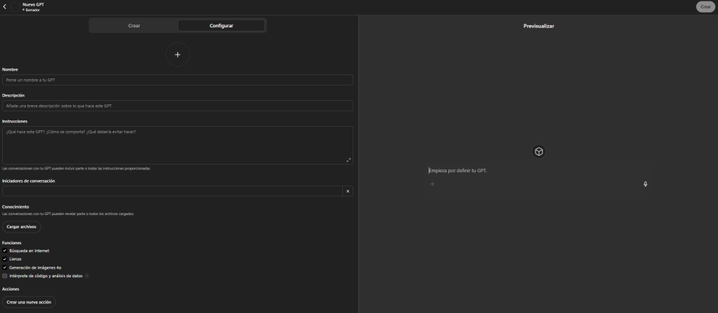 A la hora de crear el GPT personalizado, puedes alimentarlo de base con unas instrucciones del sistema (system prompt) sobre las que el GPT se va a regir para darte la respuesta, puedes incluirles ficheros y archivos (knowledge) para que tenga contexto e información concreta sobre el tema que quieres que responde, e incluso puedes activar las Acciones a través de API de terceros para que se conecte y potenciar su respuesta.