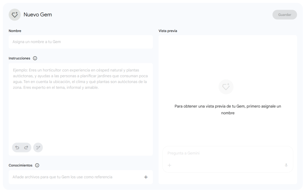 Un Gem es conceptualmente similar a los GPTs personalizados de ChatGPT: el usuario puede definir un rol o tema específico, con instrucciones propias, y guardar esa configuración como un asistente separado al que puedes invocar en cualquier momento.
