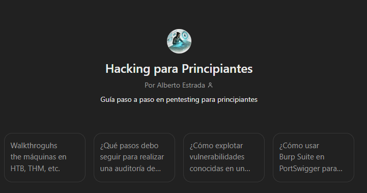 Con este GPT podrás acceder a los walkthroughs de la máquinas que he ido resolviendo en las diferentes plataformas de pentesting, y también te ayudará y guiará en todo el proceso, resolviendo tus dudas, etc.